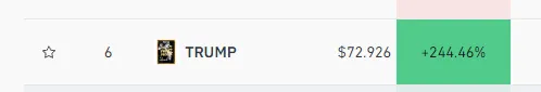 该虚拟货币推出之后大火,该币的开盘价为0.1824美元,截至发稿,TRUMP涨破70美元,也就是说,自开盘以来,TRUMP涨幅约为40000%。