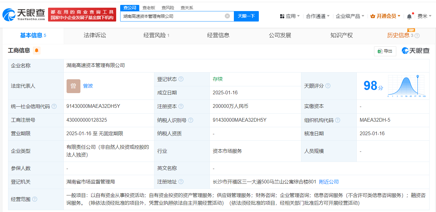 天眼查App显示,近日,湖南高速资本管理有限公司成立,法定代表人为曾波,注册资本20亿人民币,经营范围含以自有资金从事投资活动、自有资金投资的资产管理服务、供应链管理服务、财务咨询、企业管理咨询、信息咨询服务等,由湖南省高速公路集团有限公司全资持股。