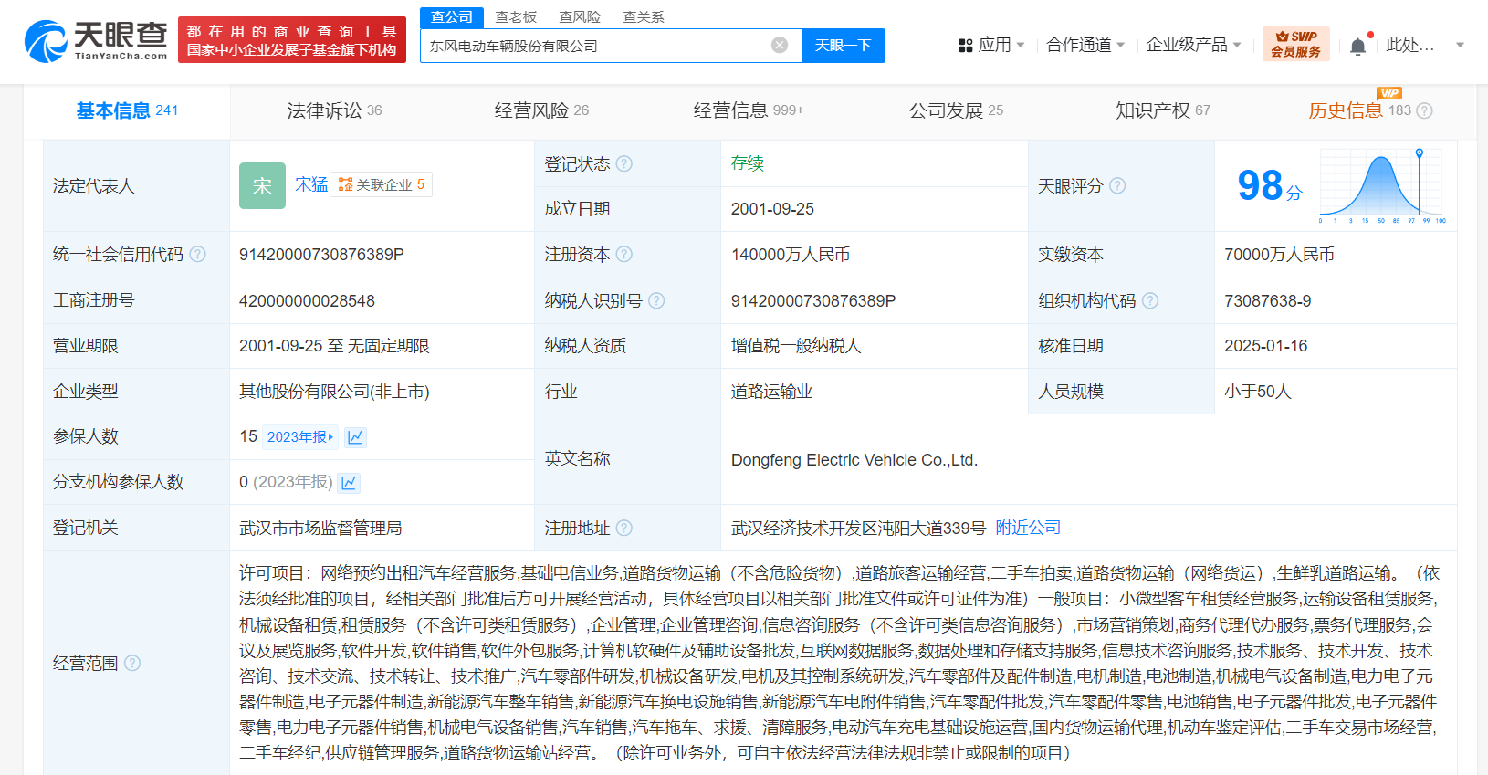 该公司成立于2001年9月,法定代表人为宋猛,经营范围含网络预约出租汽车经营服务、基础电信业务、道路货物运输、二手车拍卖、小微型客车租赁经营服务、信息咨询服务、互联网数据服务、新能源汽车整车销售、新能源汽车换电设施销售等。股东信息显示,该公司由东风汽车旗下东风畅行科技股份有限公司、风标汽车租赁服务有限公司共同持股。