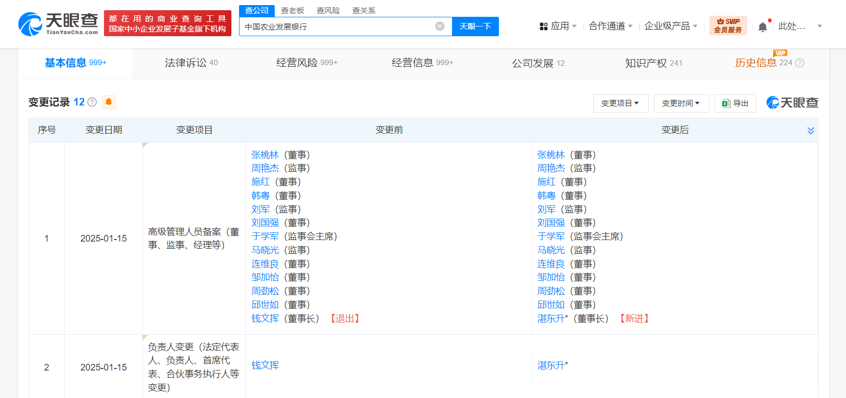 天眼查App显示,近日,中国农业发展银行发生工商变更,钱文挥卸任法定代表人、董事长,由湛东升接任。