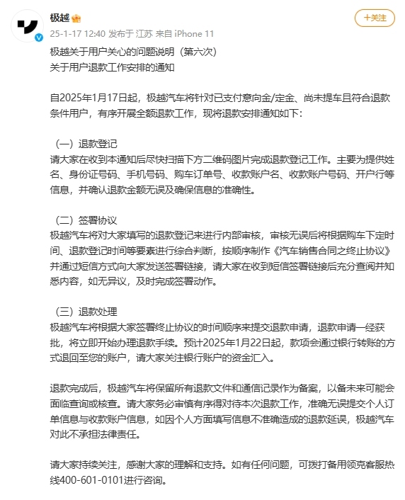 1月17日,@极越 官方微博发布《关于用户退款工作安排的通知》,宣布自2025年1月17日起将针对已支付意向金/定金、尚未提车且符合退款条件用户有序开展全额退款工作。预计1月22日起,款项会通过银行转账的方式退回至用户的账户。