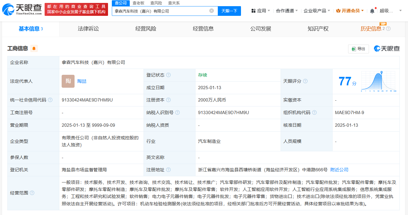 天眼查App显示,近日,拿森汽车科技(嘉兴)有限公司成立,法定代表人为陶喆,注册资本2000万人民币,经营范围包括汽车零部件研发、汽车零部件及配件制造、汽车零配件批发、汽车零配件零售、人工智能应用软件开发、人工智能行业应用系统集成服务等,由上海拿森汽车电子有限公司全资持股。