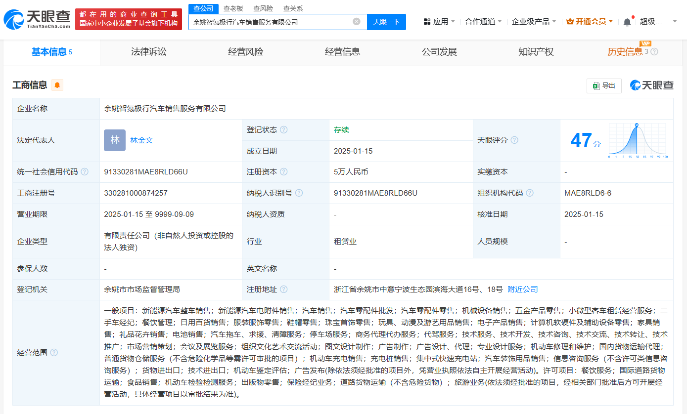 天眼查App显示,近日,余姚智氪极行汽车销售服务有限公司成立,法定代表人为林金文,注册资本5万人民币,经营范围包括新能源汽车整车销售、新能源汽车电附件销售、汽车销售、汽车零配件批发、汽车零配件零售等,由浙江极氪汽车销售有限公司全资持股。