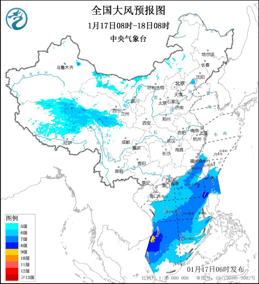 另外,由于冷空气势力减弱,我国陆地和近海的大风逐渐减小,中央气象台已解除大风蓝色预警。但预计今天,台湾海峡、台湾以东洋面、巴士海峡、南海大部海域将有7级、阵风8级的偏北到东北风,其中南海西南部海域的风力可达8级、阵风9级。