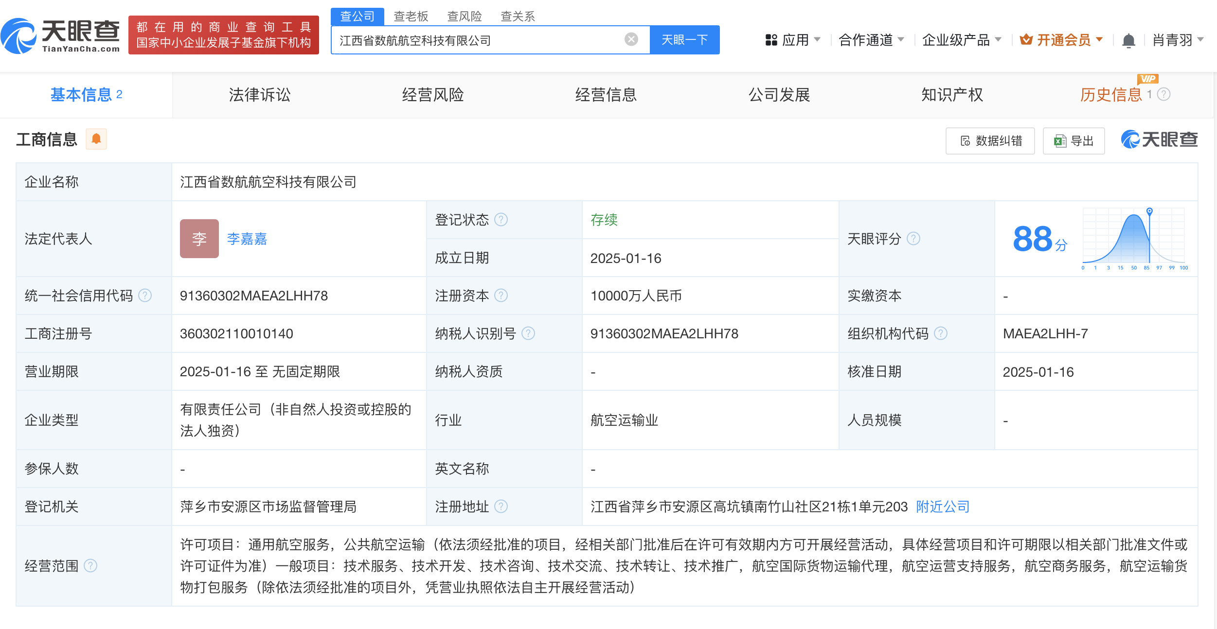 天眼查App显示,近日,江西省数航航空科技有限公司成立,法定代表人为李嘉嘉,注册资本1亿人民币,经营范围含通用航空服务、公共航空运输、航空国际货物运输代理、航空运营支持服务、航空商务服务等。股东信息显示,该公司由萍乡市安源数字投资有限公司全资持股。
