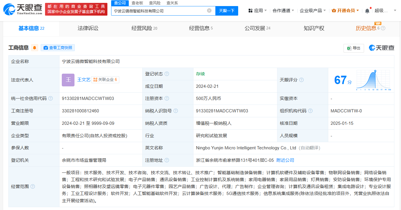 宁波云锦微智能科技有限公司成立于2024年2月,法定代表人为王文艺,注册资本500万人民币,经营范围包括智能基础制造装备销售、人工智能基础软件开发、云计算装备技术服务、5G通信技术服务等,现由王文艺、宁波云锦陇耀企业管理咨询合伙企业(有限合伙)、宁波云锦陇祁企业管理咨询合伙企业(有限合伙)等共同持股。