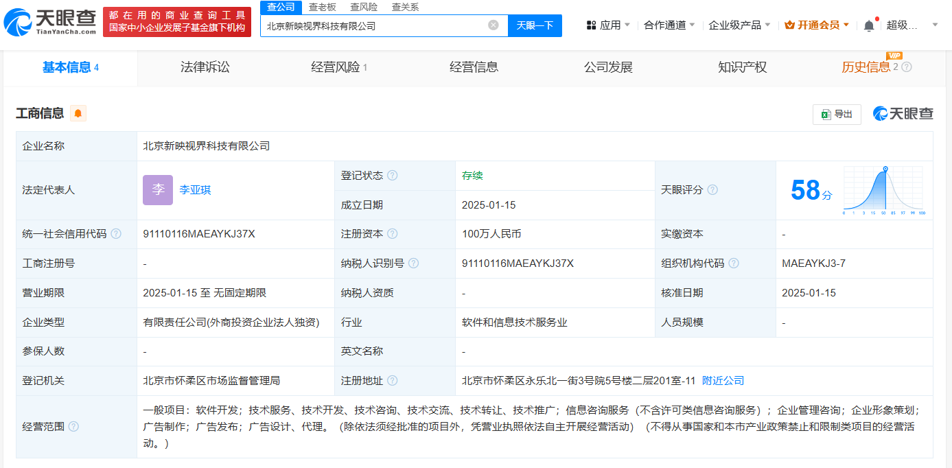 天眼查App显示,近日,北京新映视界科技有限公司成立,法定代表人为李亚琪,注册资本100万人民币,经营范围包括软件开发、企业管理咨询、企业形象策划、广告制作、广告发布等。股权全景穿透图显示,该公司由北京字跳网络技术有限公司全资持股,后者为抖音集团(香港)有限公司全资子公司。