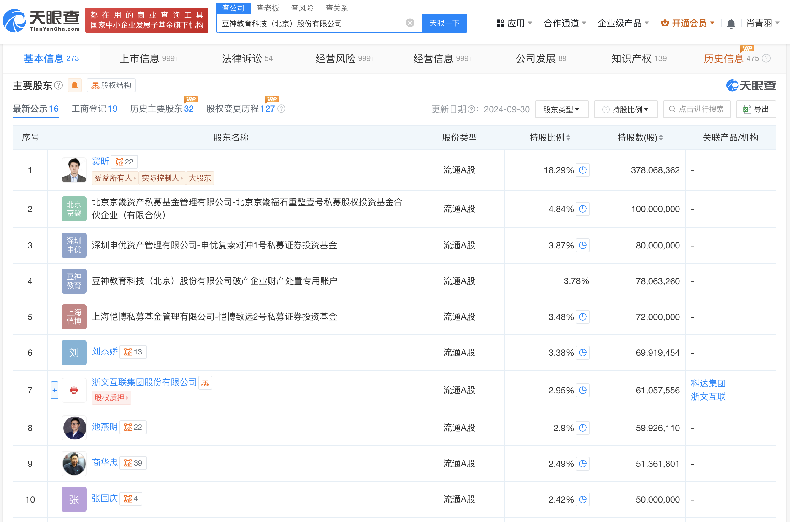 豆神教育科技(北京)股份有限公司成立于1999年1月,法定代表人为窦昕,注册资本约8.7亿人民币,经营范围包括应用软件服务、教育咨询、计算机系统服务、基础软件服务、数据处理等,由窦昕、刘杰娇等共同持股。