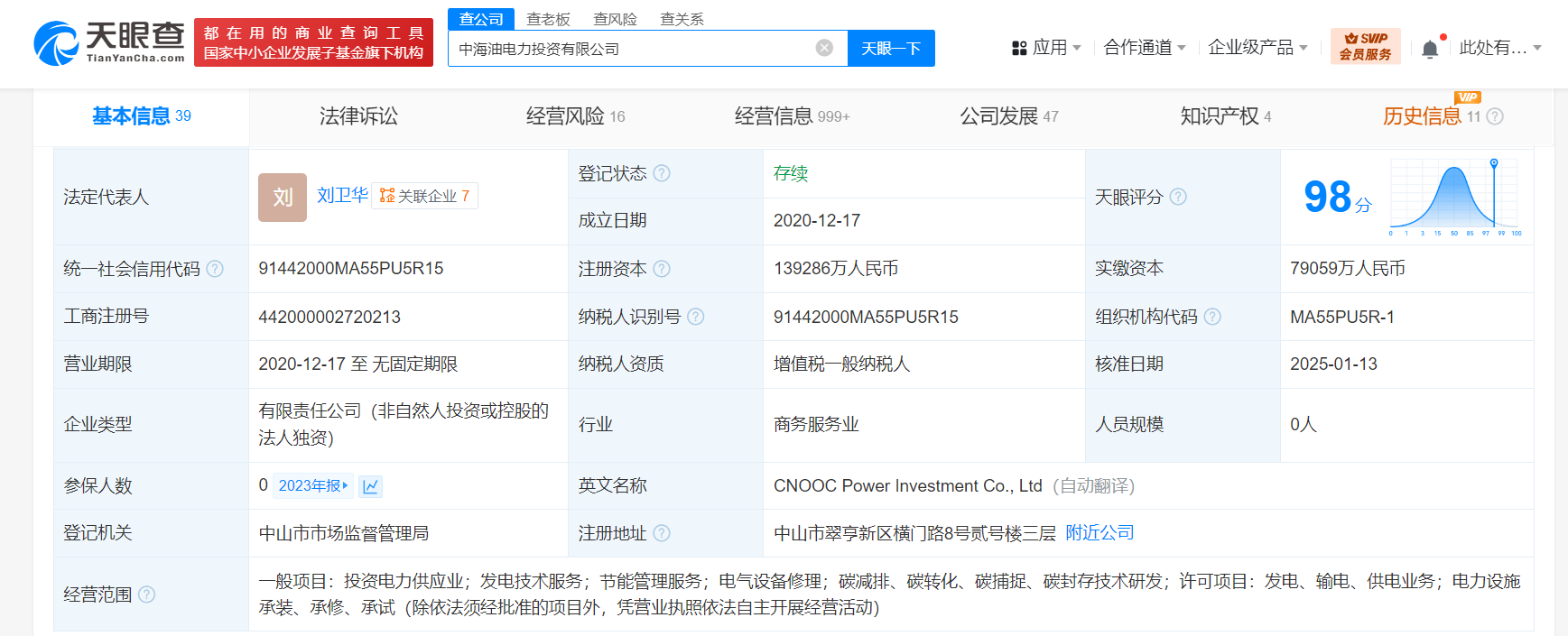 该公司成立于2020年12月,法定代表人为刘卫华,经营范围为投资电力供应业,发电技术服务,节能管理服务,电气设备修理,碳减排、碳转化、碳捕捉、碳封存技术研发,发电、输电、供电业务,电力设施承装、承修、承试。股东信息显示,该公司由中国海油集团旗下中海石油气电集团有限责任公司全资持股。