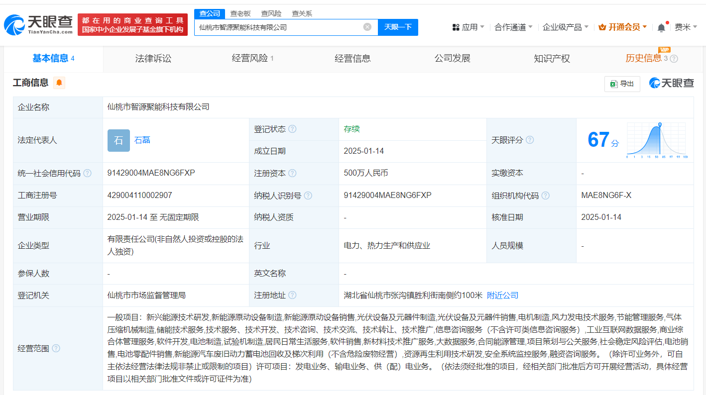 天眼查App显示,近日,青岛智源聚能科技有限公司、仙桃市智源聚能科技有限公司成立,法定代表人均为石磊,注册资本均为500万人民币,经营范围含新能源原动设备制造、新能源原动设备销售、光伏设备及元器件制造、光伏设备及元器件销售、电机制造、电池制造等,均由赣锋锂业(002460)旗下深圳易储能源科技有限公司全资持股。