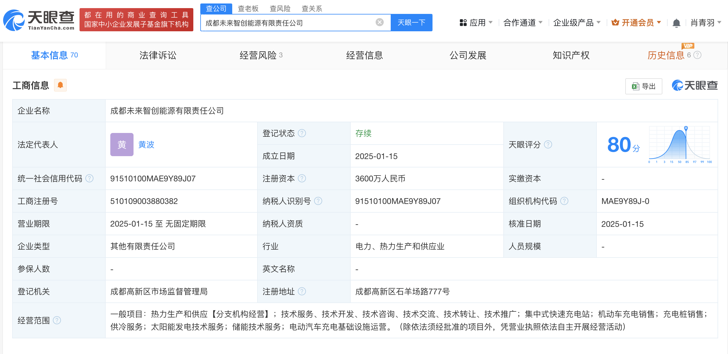天眼查App显示,近日,成都未来智创能源有限责任公司成立,法定代表人为黄波,注册资本3600万人民币,经营范围包括集中式快速充电站、机动车充电销售、充电桩销售、供冷服务、太阳能发电技术服务等。股权全景穿透图显示,该公司由成都高新未来能源发展有限责任公司、中国能建(601868)旗下中国葛洲坝集团装备工业有限公司、中国建筑(601668)旗下中国建筑第五工程局有限公司共同持股。