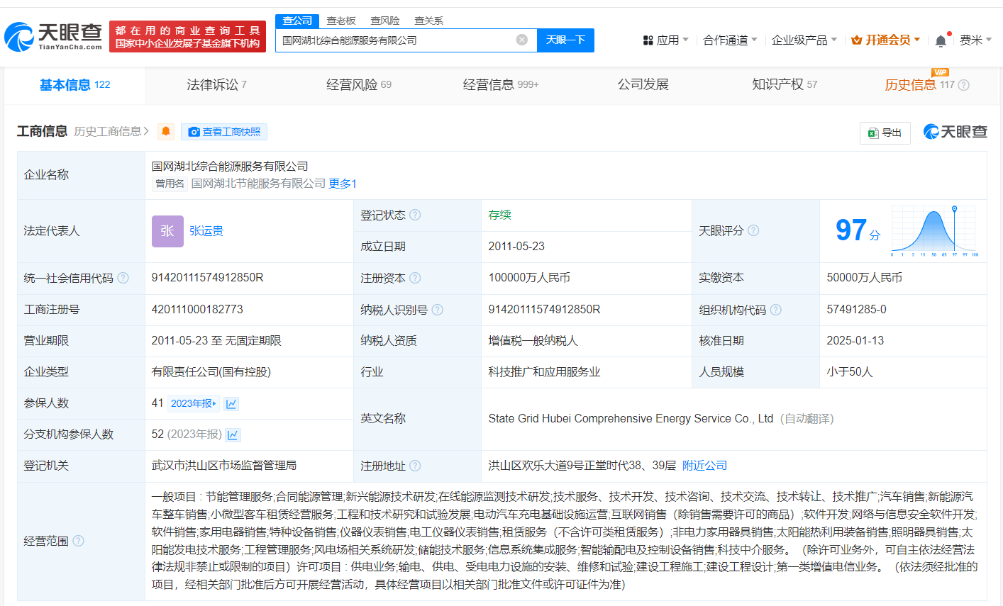 天眼查App显示,近日,国网湖北综合能源服务有限公司发生工商变更,注册资本由5亿人民币增至10亿人民币,增幅100%。
