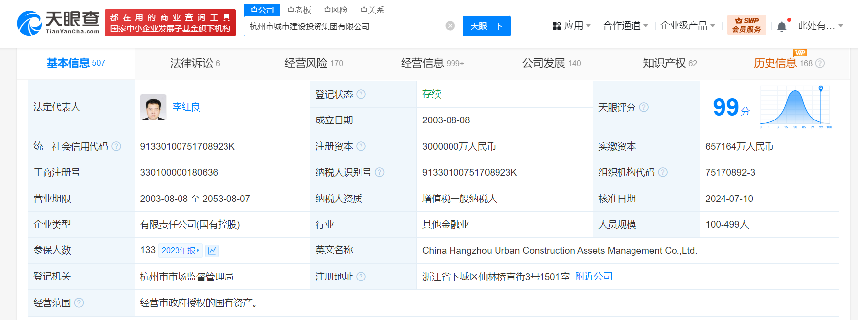 天眼查App显示,近日,杭州市城市建设投资集团有限公司发生工商变更,注册资本由约99.75亿人民币增至300亿人民币,增幅约201%。