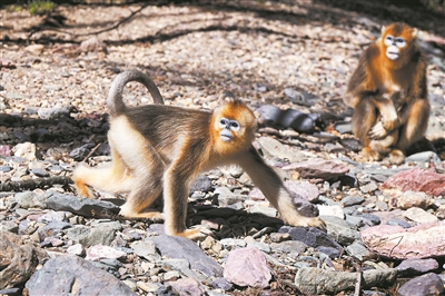 金丝猴在神农架国家公园大龙潭金丝猴野外研究基地山林中活动。新华社记者 肖艺九摄