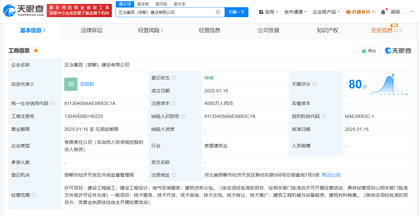 天眼查App显示,近日,五冶集团(邯郸)建设有限公司成立,法定代表人为田廷权,注册资本4000万人民币,经营范围包括建设工程施工、建设工程设计、电气安装服务、建筑劳务分包等,由中国五冶集团有限公司全资持股。