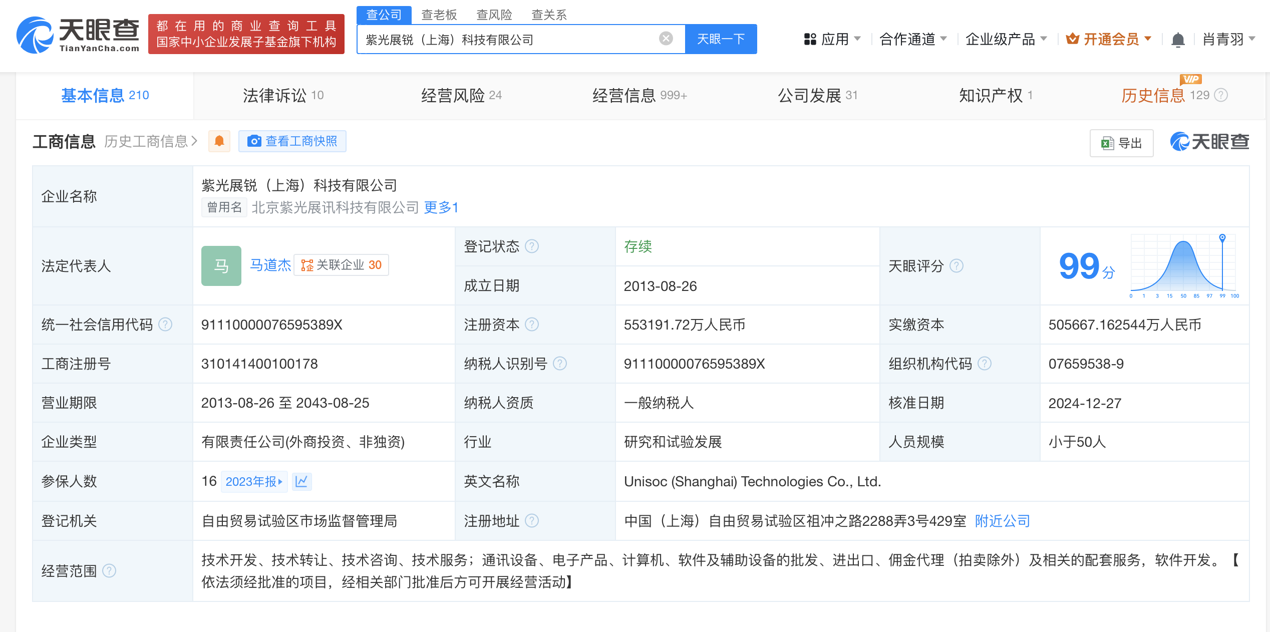 天眼查App显示,近日,紫光展锐(上海)科技有限公司发生工商变更,新增苏州璞华荃芯投资合伙企业(有限合伙)、苏州璞华吉芯投资合伙企业(有限合伙)、苏州璞华锐芯投资合伙企业(有限合伙)为股东,同时注册资本由约53.8亿人民币增至约55.3亿人民币。