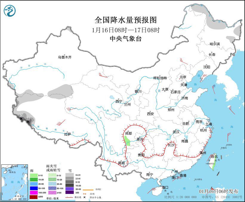 1月16日8时至17日8时,西藏西部、新疆南部、黑龙江北部等地部分地区有小到中雪或雨夹雪,其中,西藏西南部局地大到暴雪(10~16毫米)。西藏中西部、青海西南部等地部分地区将有5~6级、阵风7~8级的大风。