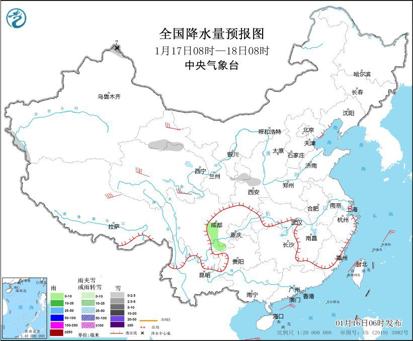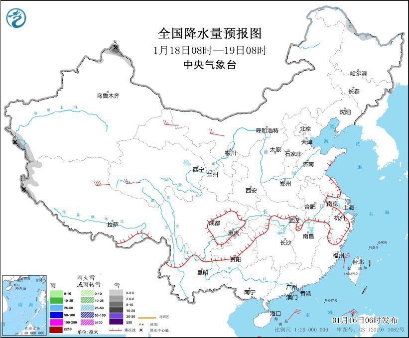 1月17日8时至18日8时,新疆北疆北部和南疆西部山区、青海北部、甘肃西南部、陕西中部等地部分地区有小雪或雨夹雪,其中,新疆北疆北部局地有中到大雪(5~7毫米)。四川盆地南部、云南东北部等地部分地区有小雨。西藏中部、青海中部和南部、内蒙古西部、甘肃西北部等地将有5~6级、阵风7~8级的大风;台湾海峡、巴士海峡、南海东部和西南部海域将有7~8级、阵风9级的东北风,其中南海西南部的部分海域风力可达9级、阵风10级。