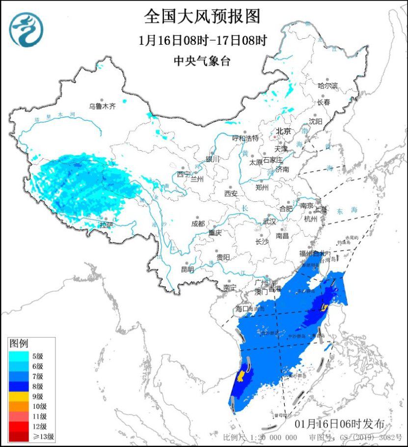 受较强冷空气影响,预计,1月16日8时至17日8时,西藏中西部、青海西南部等地将有5~6级、阵风7~8级的大风;台湾海峡、巴士海峡、南海大部海域将有7~8级、阵风9级的东北风,其中巴士海峡、南海东北部和西南部的部分海域风力可达9级、阵风10级。中央气象台1月16日6时继续发布大风蓝色预警。