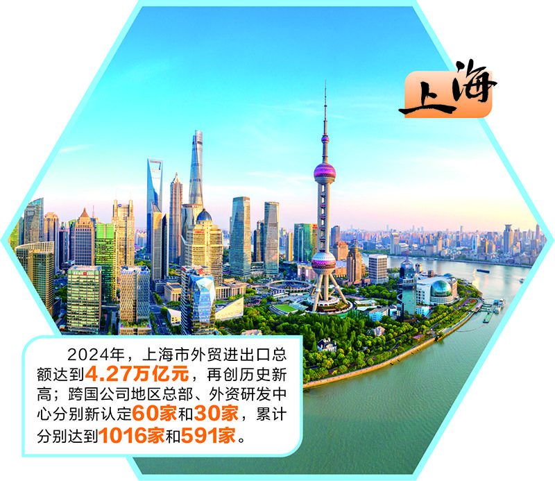 2024年,上海市外贸进出口总额达到4.27万亿元,再创历史新高;跨国公司地区总部、外资研发中心分别新认定60家和30家,累计分别达到1016家和591家;金融市场交易总额达到3650万亿元,增长8.2%;人均可支配收入达到8.8万元,增长4.1%左右。