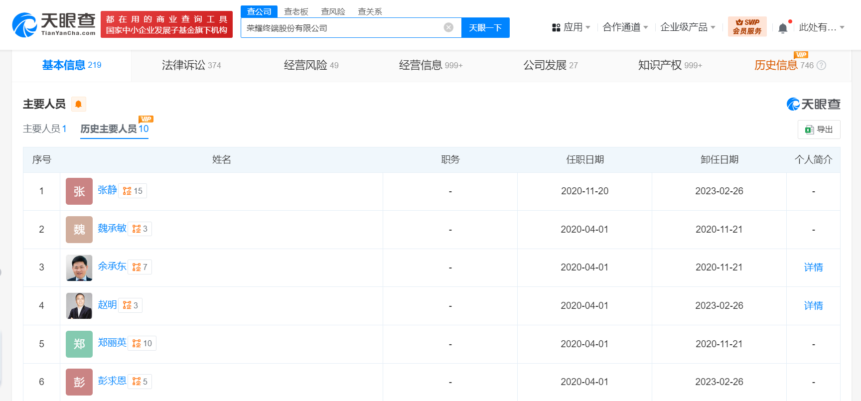 天眼查商业履历信息显示,赵明名下共关联3家企业,目前西安荣耀终端有限公司、北京荣耀终端有限公司为存续状态,赵明在上述公司担任董事长职务。值得一提的是,此前,赵明已卸任荣耀终端股份有限公司董事职务。