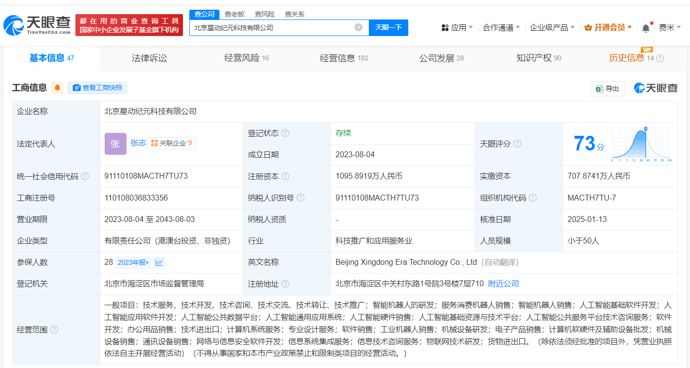北京星动纪元科技有限公司成立于2023年8月,法定代表人为张志,经营范围含智能机器人的研发、服务消费机器人销售、智能机器人销售、人工智能基础软件开发、人工智能应用软件开发、人工智能公共数据平台等,现由陈建宇、南京达极机器人合伙企业(有限合伙)等及上述新增股东共同持股。官网显示,该公司是唯一一家清华大学占股的人形机器人企业。