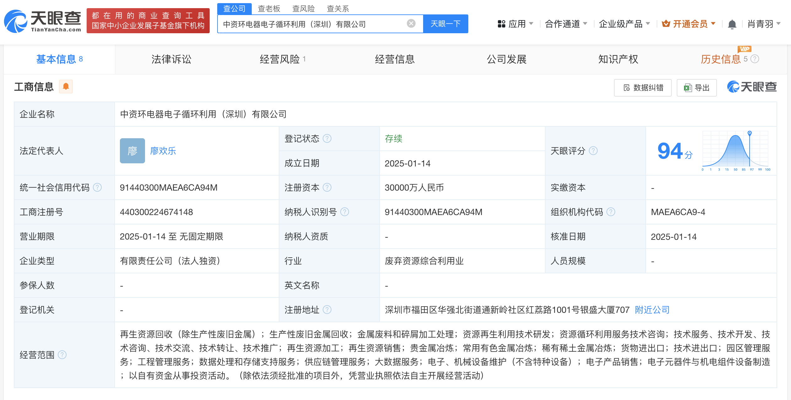 天眼查App显示,近日,中资环电器电子循环利用(深圳)有限公司成立,法定代表人为廖欢乐,注册资本3亿人民币,经营范围含再生资源回收、生产性废旧金属回收、金属废料和碎屑加工处理、资源再生利用技术研发、资源循环利用服务技术咨询、数据处理和存储支持服务、供应链管理服务、大数据服务等,由华润环保发展有限公司全资持股。
