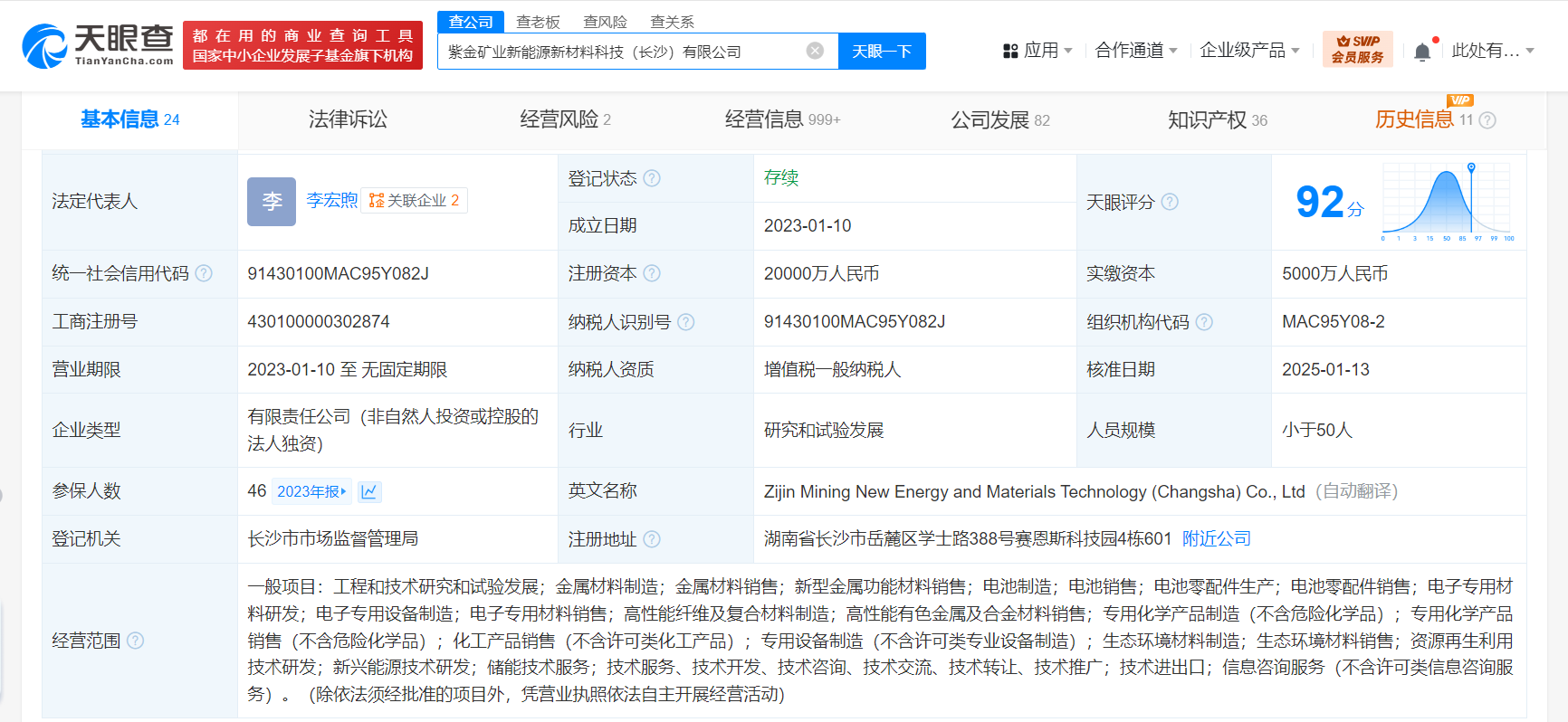 天眼查App显示,近日,紫金矿业新能源新材料科技(长沙)有限公司发生工商变更,注册资本由5000万人民币增至2亿人民币,增幅300%。