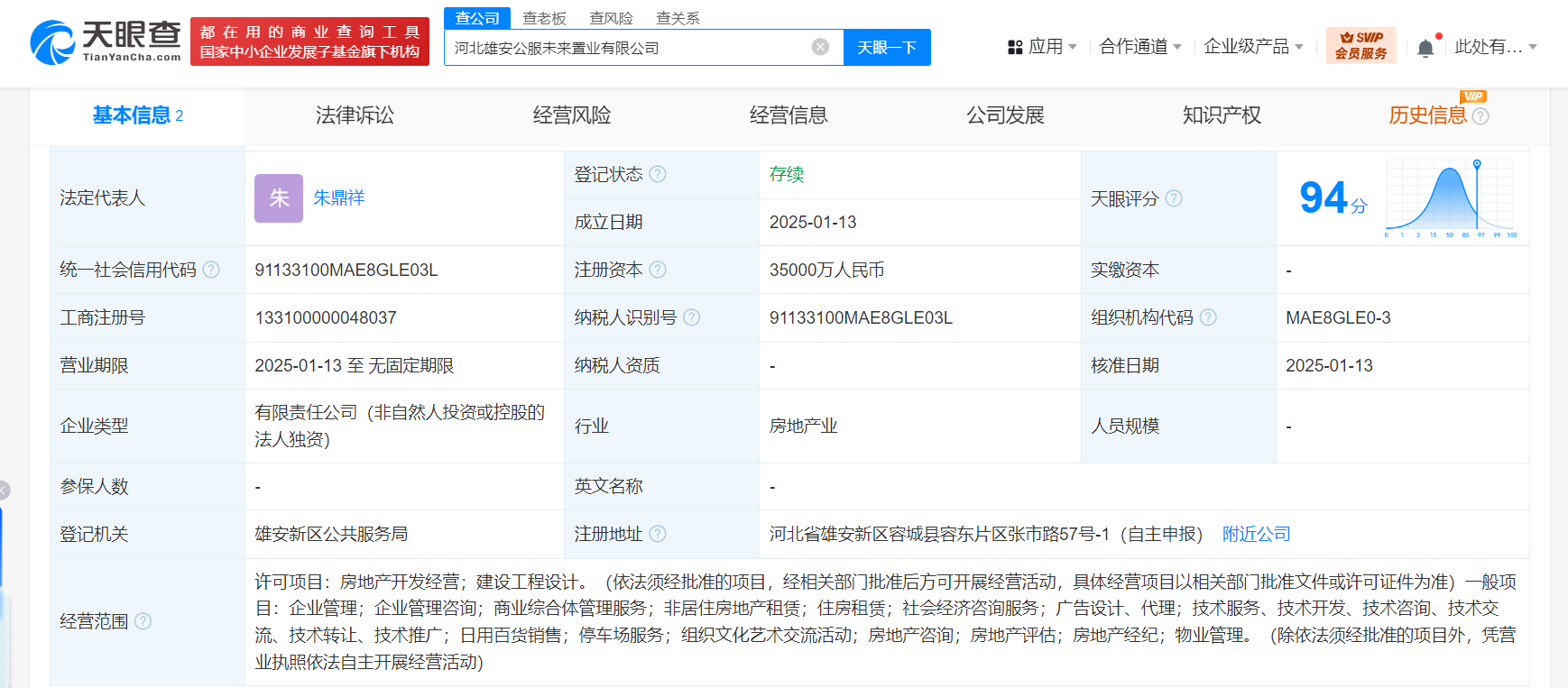 天眼查App显示,近日,河北雄安公服未来置业有限公司成立,法定代表人为朱鼎祥,注册资本3.5亿人民币,经营范围含房地产开发经营、建设工程设计、企业管理、企业管理咨询、商业综合体管理服务、非居住房地产租赁、住房租赁、社会经济咨询服务、组织文化艺术交流活动等。股东信息显示,该公司由中国雄安集团公共服务管理有限公司全资持股。