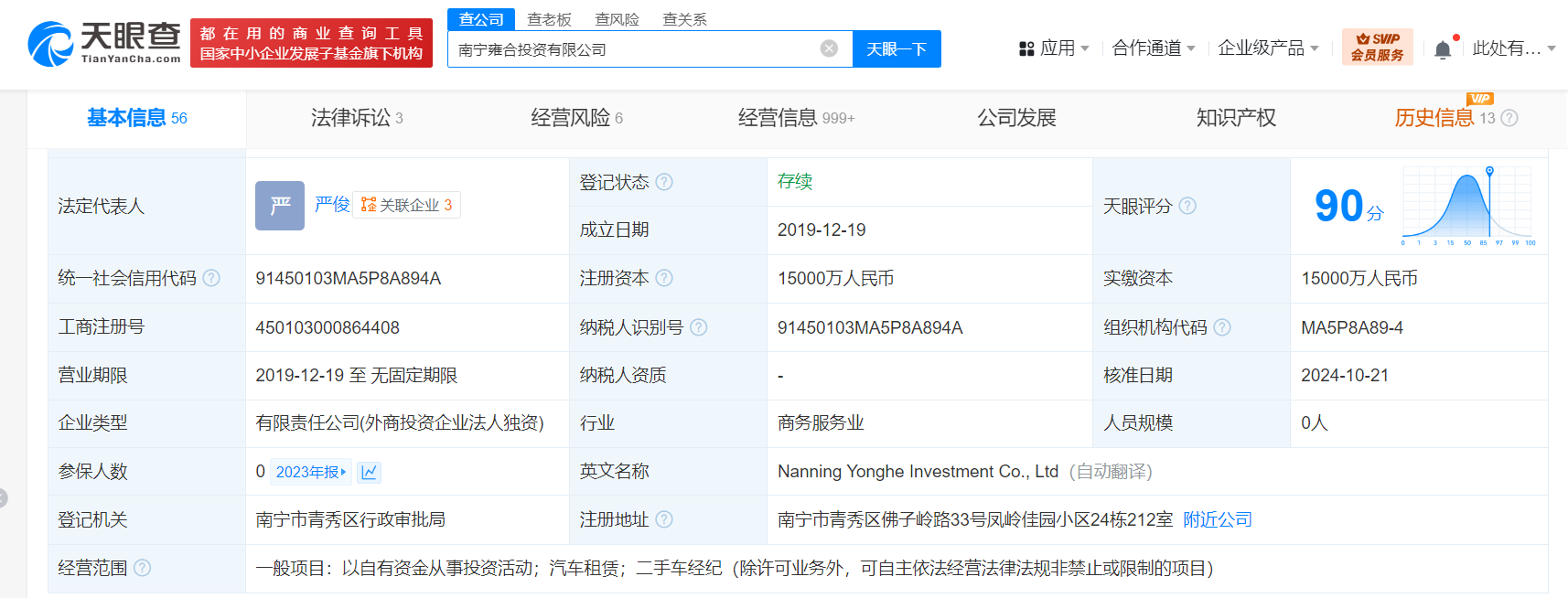 南宁雍合投资有限公司成立于2019年12月,法定代表人为严俊,注册资本1.5亿人民币,经营范围为以自有资金从事投资活动、汽车租赁、二手车经纪,由合众新能源汽车股份有限公司全资持股。