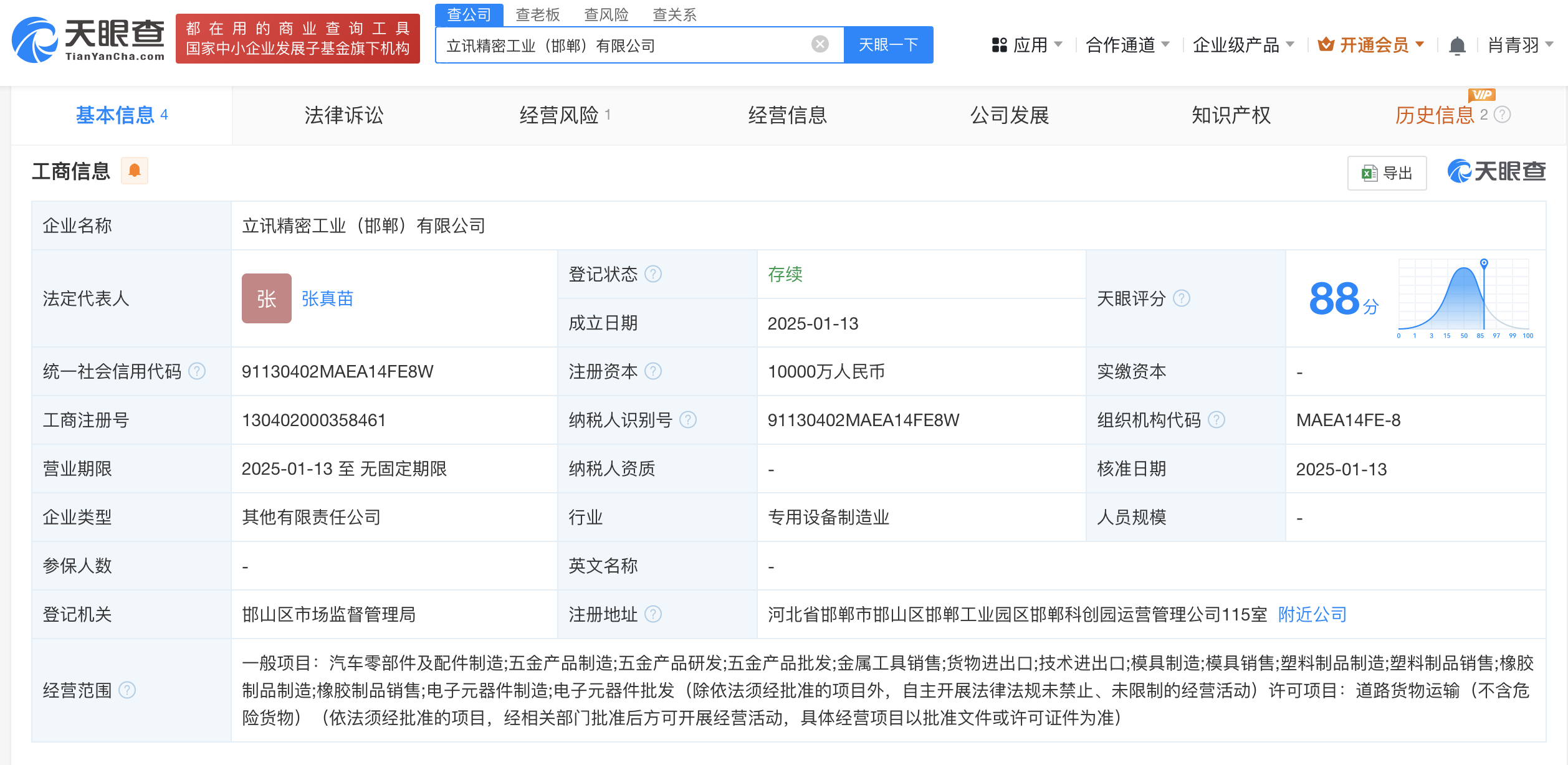 天眼查App显示,近日,立讯精密工业(邯郸)有限公司成立,法定代表人为张真苗,注册资本1亿人民币,经营范围为汽车零部件及配件制造、五金产品制造、五金产品研发、五金产品批发等。股权全景穿透图显示,该公司由立讯精密工业(昆山)有限公司全资持股,后者为立讯精密(002475)全资子公司。