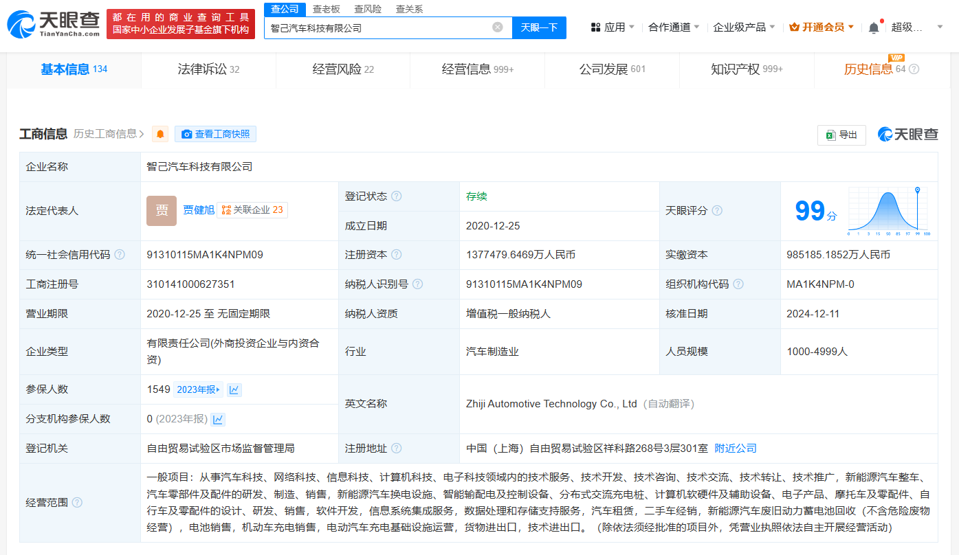 其总公司智己汽车科技有限公司成立于2020年12月,法定代表人为贾健旭,注册资本约137.7亿人民币,由上海元界智能科技股权投资基金合伙企业(有限合伙)、杭州灏月企业管理有限公司、上海汽车集团股份有限公司等共同持股。分支机构信息显示,智己汽车科技有限公司有4家分支机构,目前上海、苏州、南京公司仍在存续状态。