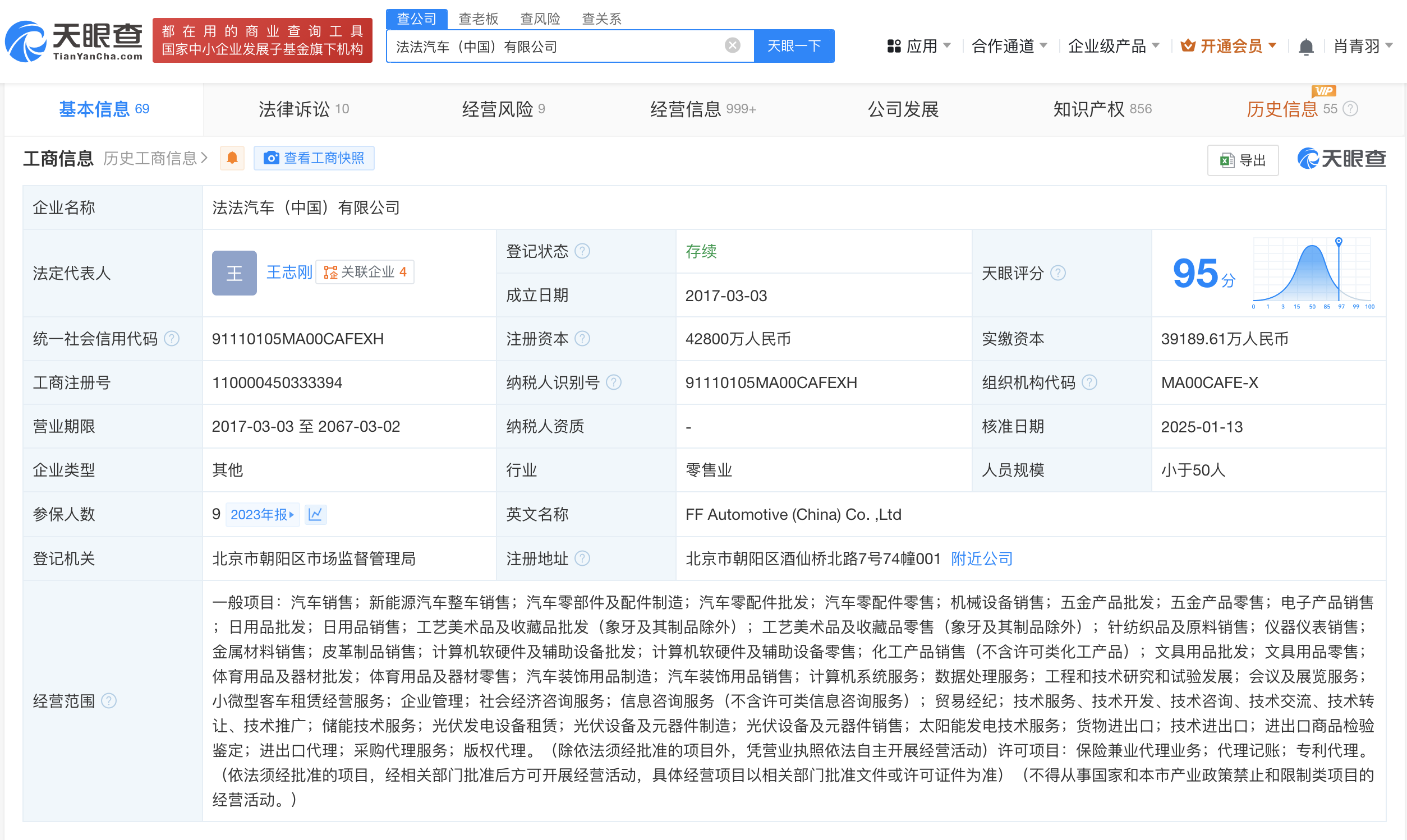 该公司成立于2017年3月,经营范围包括汽车销售、新能源汽车整车销售、汽车零部件及配件制造、汽车零配件批发、计算机软硬件及辅助设备批发等,由FF Hong Kong Holding Limited、乐视汽车科技(北京)有限公司共同持股。