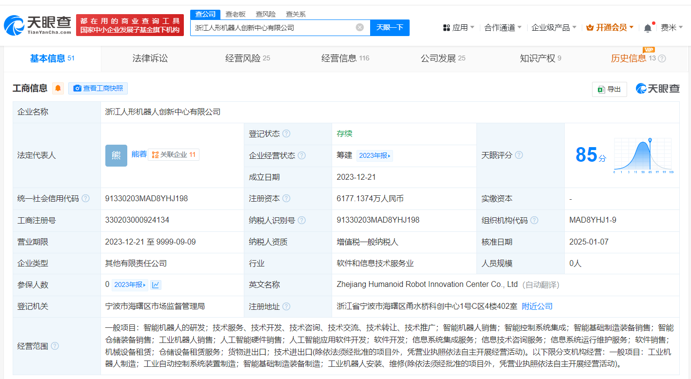 浙江人形机器人创新中心有限公司成立于2023年12月,法定代表人为熊蓉,经营范围含智能机器人的研发、智能机器人销售、智能控制系统集成、智能基础制造装备销售、智能仓储装备销售、工业机器人销售等,现由中控技术股份有限公司、宁波领跑者企业管理合伙企业(有限合伙)等及上述新增股东共同持股。