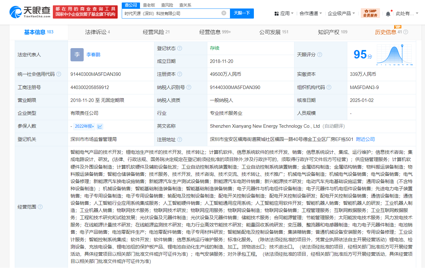 该公司成立于2018年11月,法定代表人为李春鹏,注册资本4.95亿人民币,经营范围含智能电气产品的技术开发,锂电池生产技术的技术开发、技术转让,计算机软件、信息系统软件的技术开发、销售,信息系统设计、集成、运行维护,人工智能行业应用系统集成服务,人工智能通用应用系统,人工智能应用软件开发,智能机器人销售等。股东信息显示,该公司由宁德时代(300750)、深圳市利阳壹号咨询合伙企业(有限合伙)、深圳德毅新能咨询合伙企业(有限合伙)等共同持股。