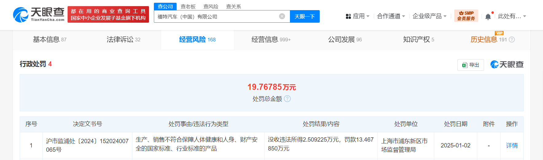 天眼查App显示,近日,福特汽车(中国)有限公司因销售不合格的燃油添加剂,被上海市浦东新区市场监督管理局罚款13.4万余元,没收违法所得2.5万余元。