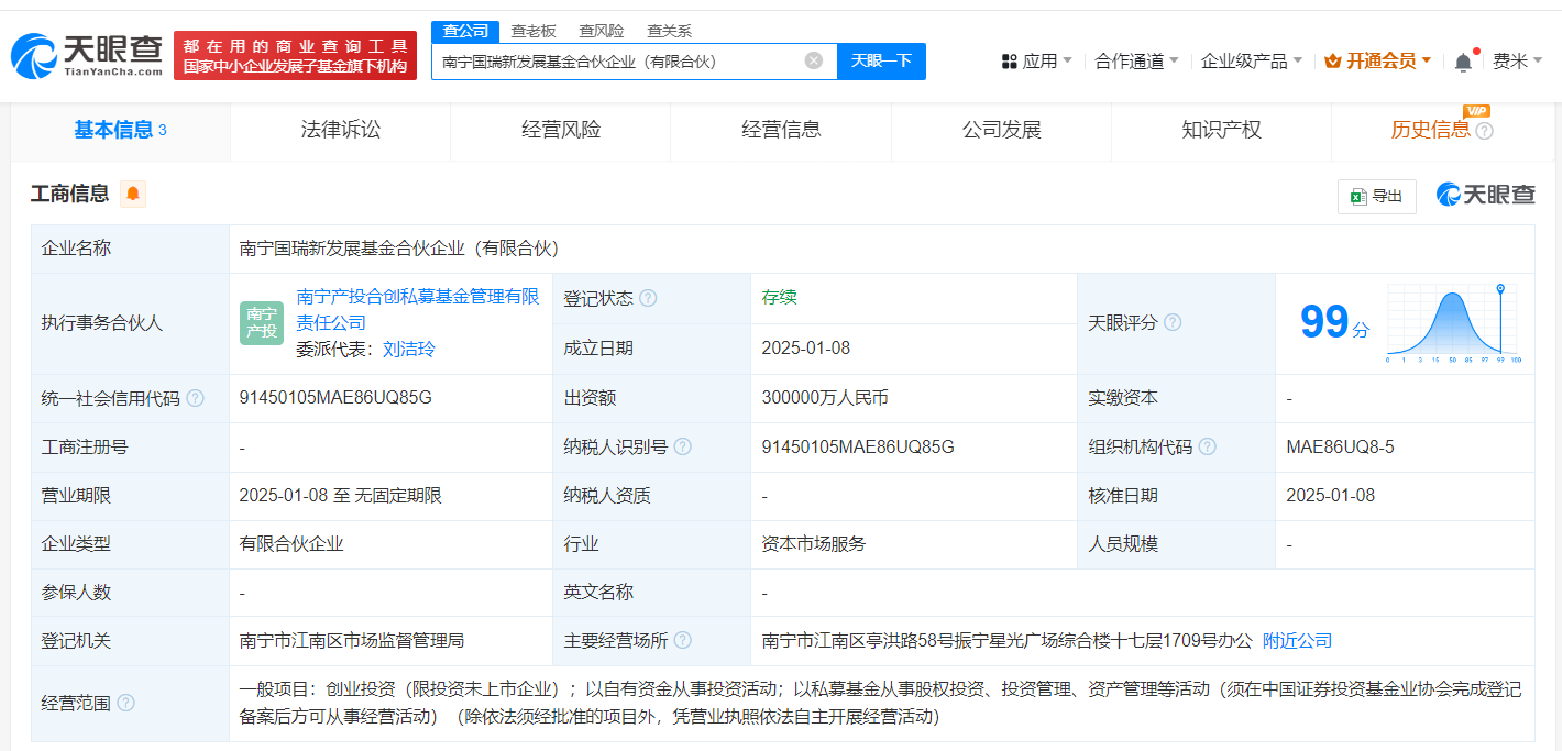 天眼查App显示,近日,南宁国瑞新发展基金合伙企业(有限合伙)成立,执行事务合伙人为南宁产投合创私募基金管理有限责任公司,出资额30亿人民币,经营范围为创业投资,以自有资金从事投资活动,以私募基金从事股权投资、投资管理、资产管理等活动,由南宁产业投资集团有限责任公司、南宁产投合创私募基金管理有限责任公司共同持股。