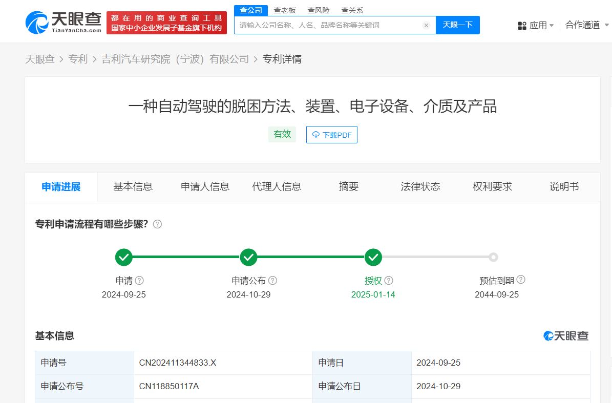 天眼查知识产权信息显示,近日,浙江吉利控股集团有限公司、吉利汽车研究院(宁波)有限公司申请的“一种自动驾驶的脱困方法、装置、电子设备、介质及产品”专利获授权。