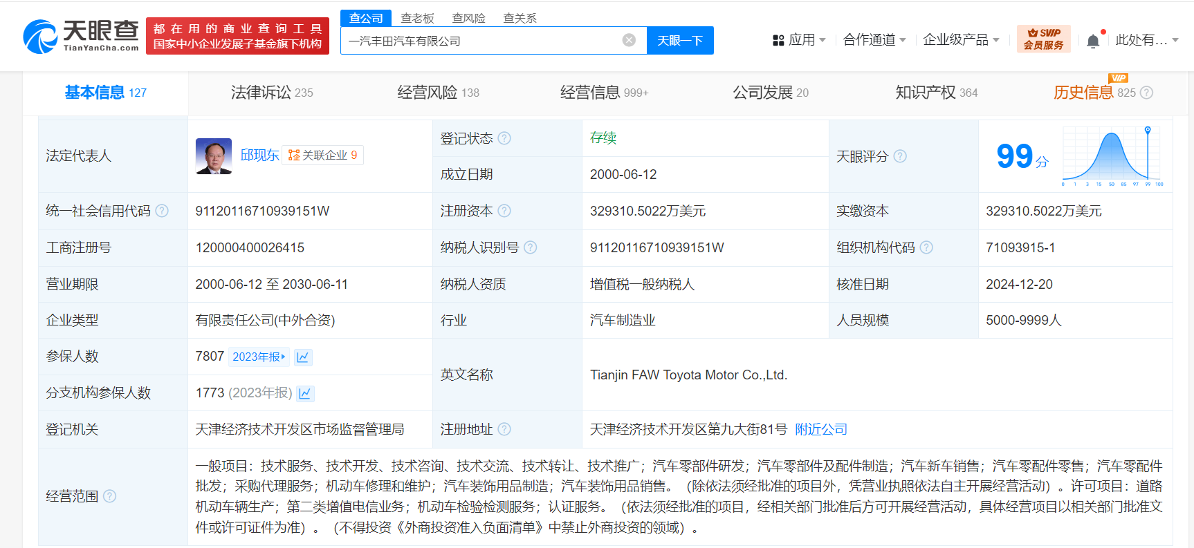 一汽丰田汽车有限公司成立于2000年6月,法定代表人为邱现东,注册资本约32.9亿美元,经营范围含汽车零部件研发、汽车零部件及配件制造、汽车新车销售、汽车零配件零售、道路机动车辆生产、第二类增值电信业务、机动车检验检测服务等。股东信息显示,该公司由中国第一汽车股份有限公司、丰田汽车公司(TOYOTA MOTOR CORPORATION)、丰田汽车(中国)投资有限公司共同持股。天眼风险信息显示,该公司现存3条被执行人信息,被执行总金额399万余元。