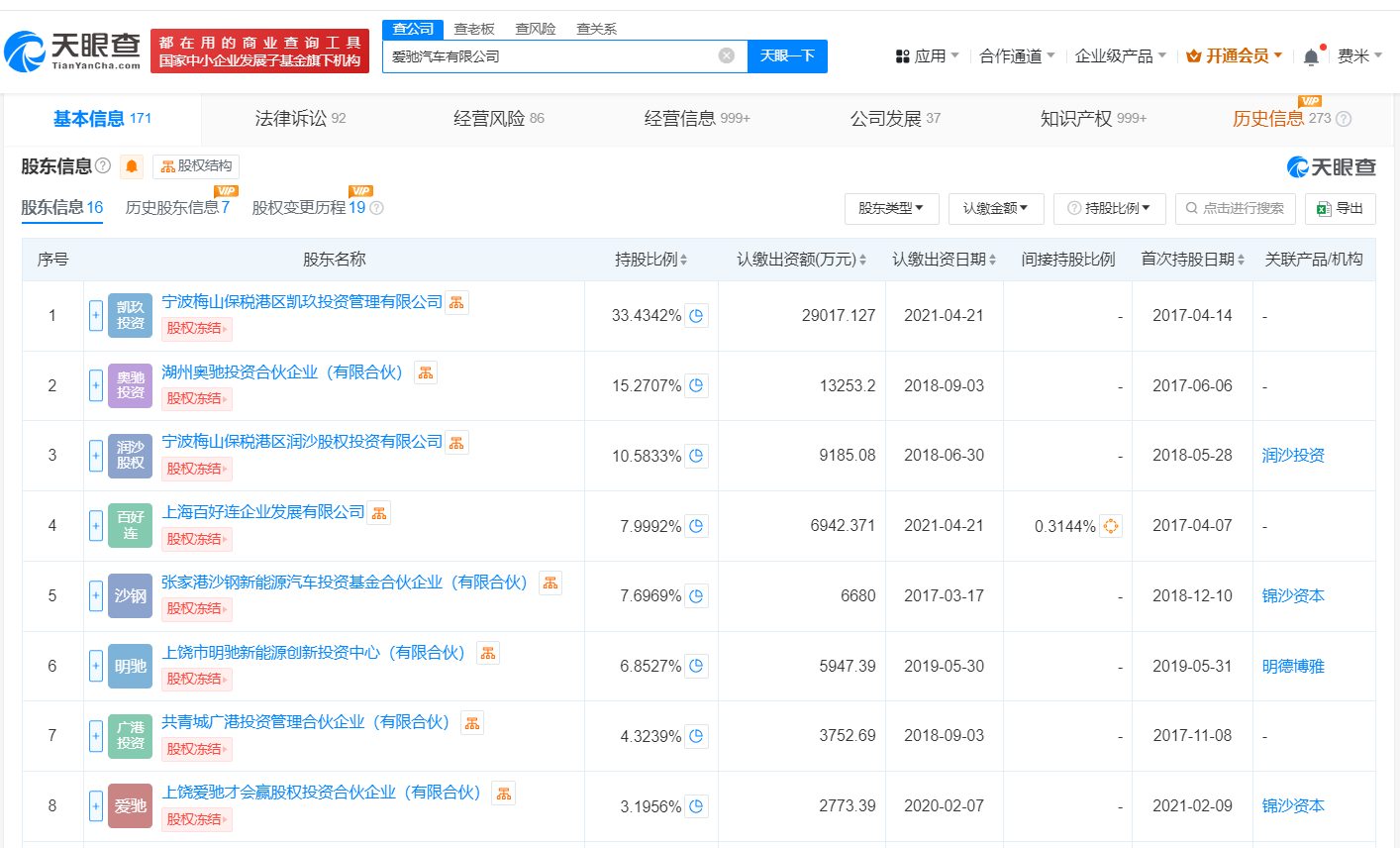 爱驰汽车有限公司成立于2017年2月,法定代表人为郭超,注册资本约8.7亿人民币,经营范围含从事新能源汽车及零部件的技术研发、产品开发等,由宁波梅山保税港区凯玖投资管理有限公司、湖州奥驰投资合伙企业(有限合伙)、宁波梅山保税港区润沙股权投资有限公司等共同持股。风险信息显示,该公司现存多条被执行人、股权冻结信息。