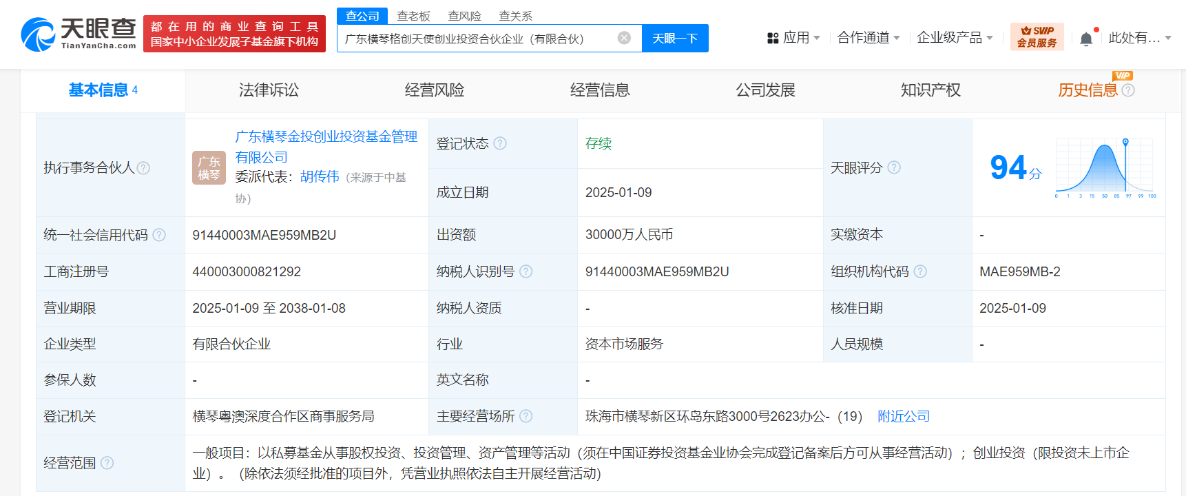 天眼查App显示,近日,广东横琴格创天使创业投资合伙企业(有限合伙)成立,执行事务合伙人为广东横琴金投创业投资基金管理有限公司,出资额3亿人民币,经营范围为以私募基金从事股权投资、投资管理、资产管理等活动,创业投资。合伙人信息显示,该合伙企业由中金资本旗下横琴粤澳深度合作区产业投资基金(有限合伙)、格力集团旗下珠海横琴新区天使母基金合伙企业(有限合伙)、广东横琴金投创业投资基金管理有限公司共同出资。