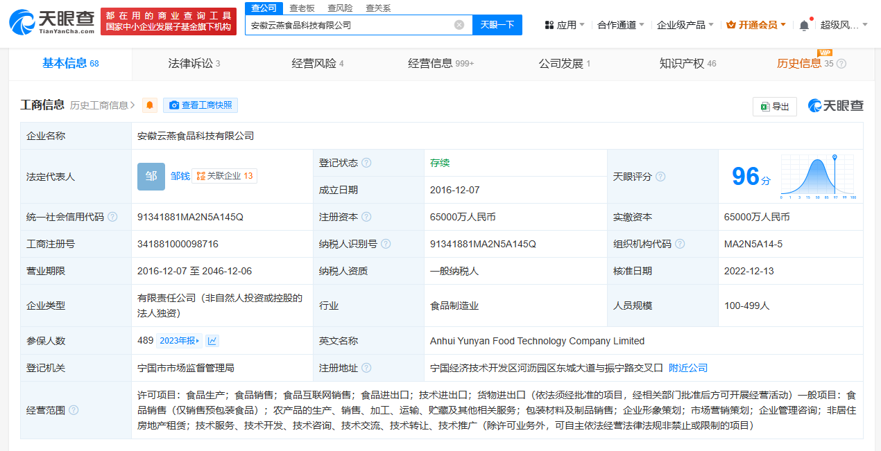 该公司成立于2016年12月,法定代表人为邹钱,注册资本6.5亿人民币,经营范围包括食品生产、食品销售、食品互联网销售等,由紫燕食品(603057)全资持股。