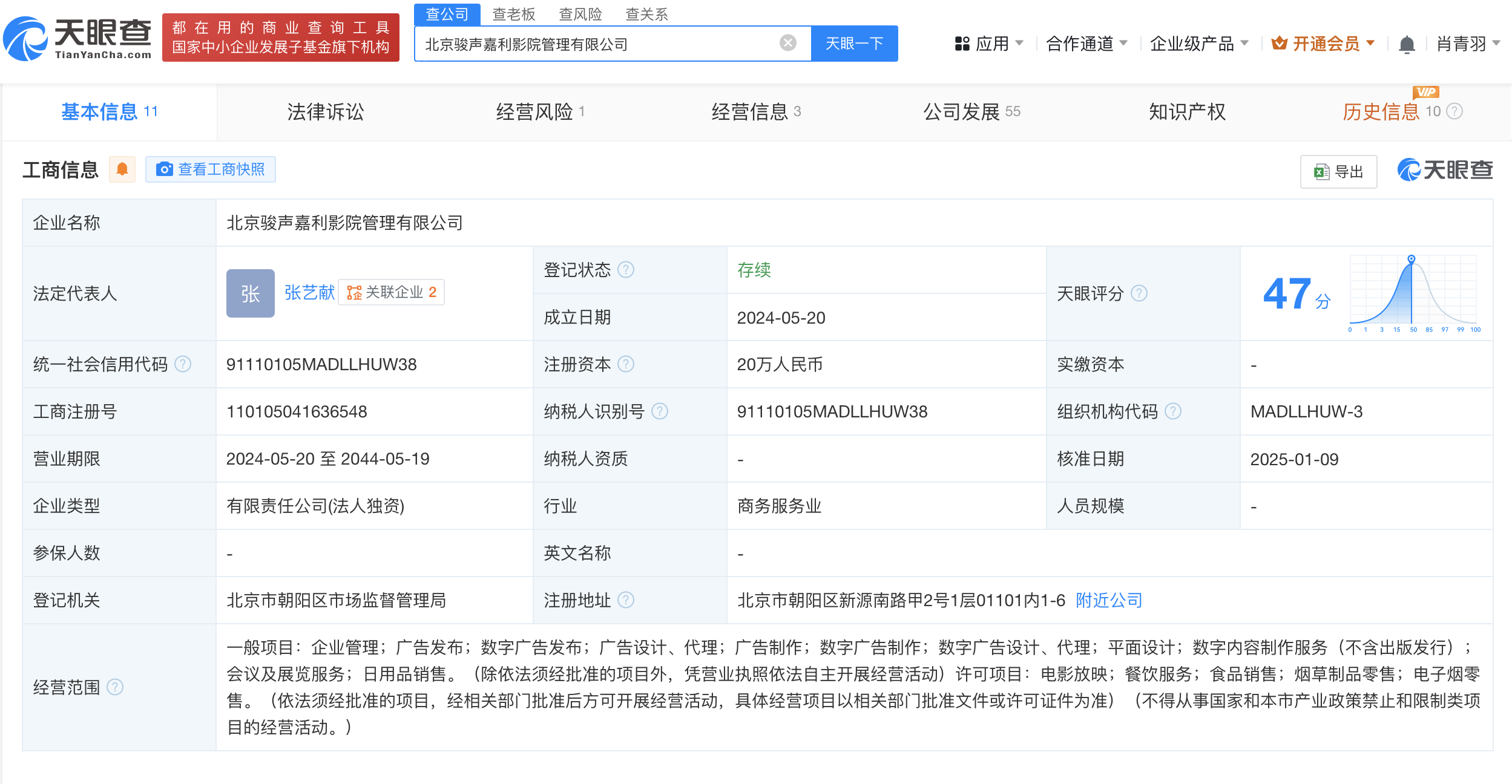 该公司成立于2024年5月,注册资本20万人民币,经营范围含企业管理、广告发布、数字广告发布、数字内容制作服务、电影放映、餐饮服务等。