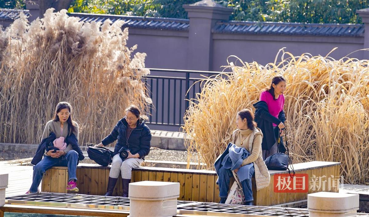 在武汉植物园,几名女子享受温暖的阳光晒背
