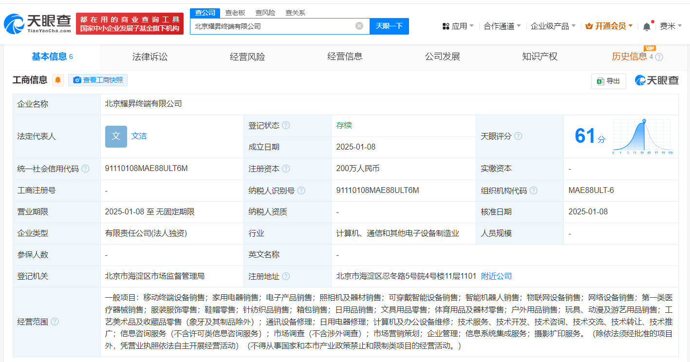 天眼查App显示,近日,北京耀昇终端有限公司、西安星耀终端商贸有限公司成立,法定代表人均为文洁,注册资本均为200万人民币,经营范围含移动终端设备销售、家用电器销售、智能机器人销售等,均由荣耀旗下深圳星耀终端有限公司全资持股。