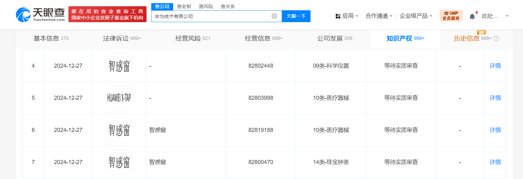 天眼查知识产权信息显示,近日,华为技术有限公司申请注册三枚“智感窗”商标,国际分类为科学仪器、医疗器械、珠宝钟表,当前商标状态均为等待实质审查。
