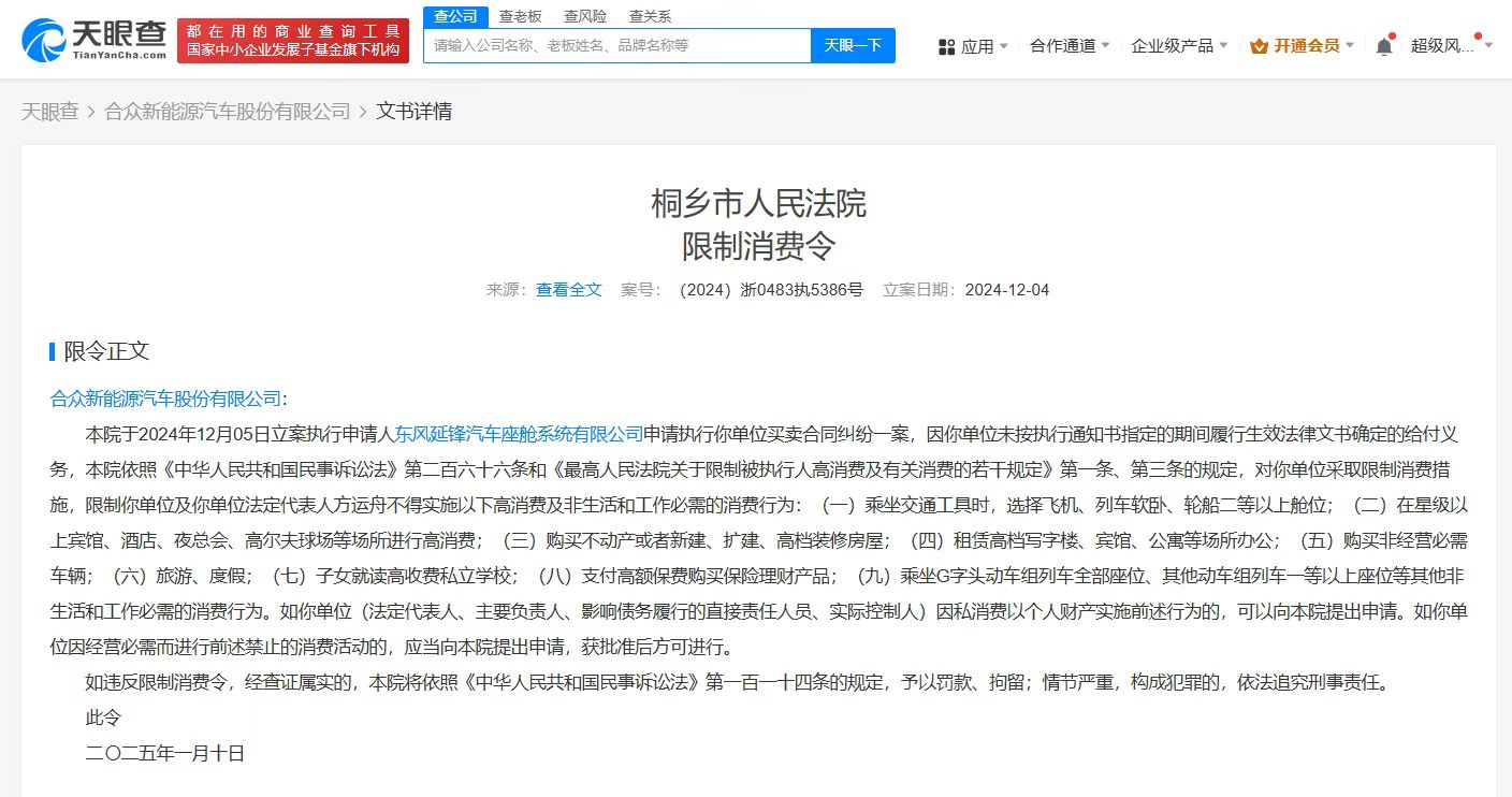天眼查法律诉讼信息显示,近日,因未按指定期间履行生效法律文书确定的给付义务,哪吒汽车关联公司合众新能源汽车股份有限公司及其法定代表人方运舟被限制高消费,涉及与东风延锋汽车座舱系统有限公司相关买卖合同纠纷案件,执行法院为桐乡市人民法院。案件流程信息显示,此前,该公司已因此案被强执911万余元。