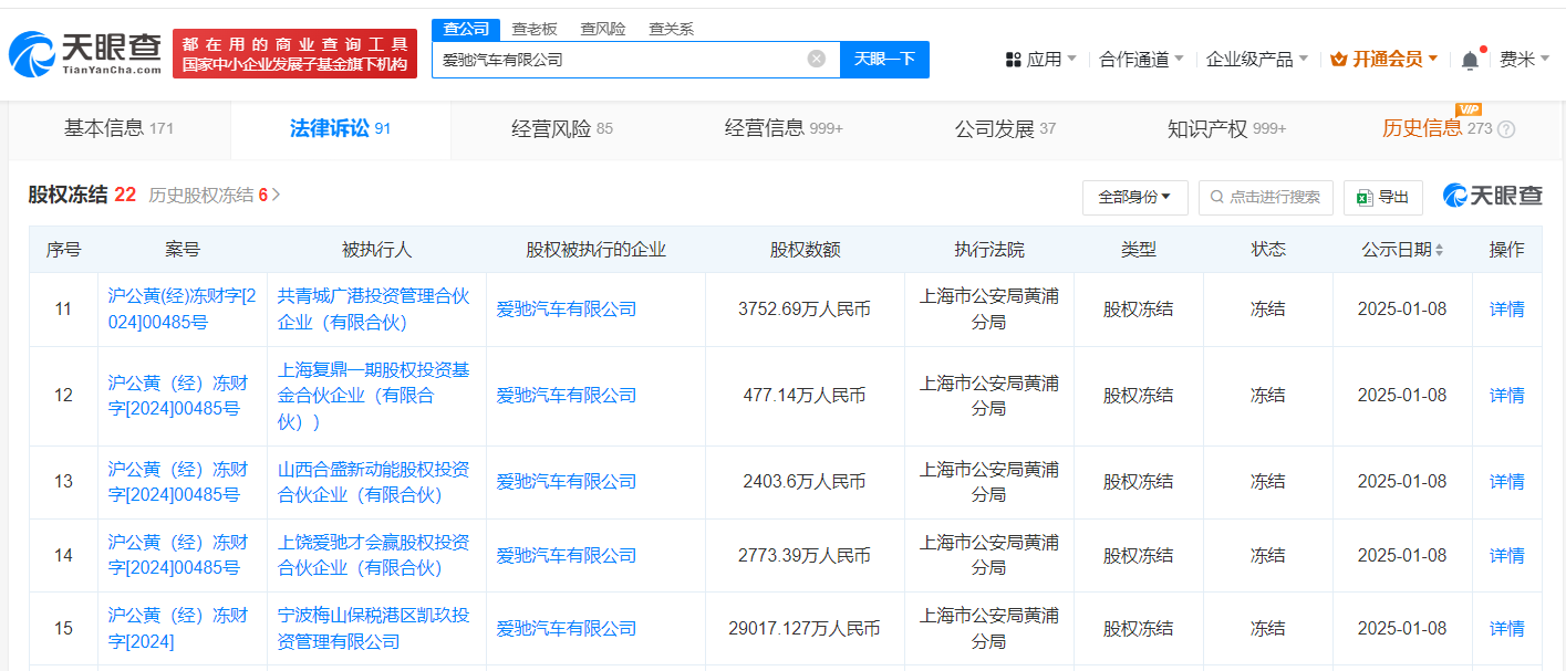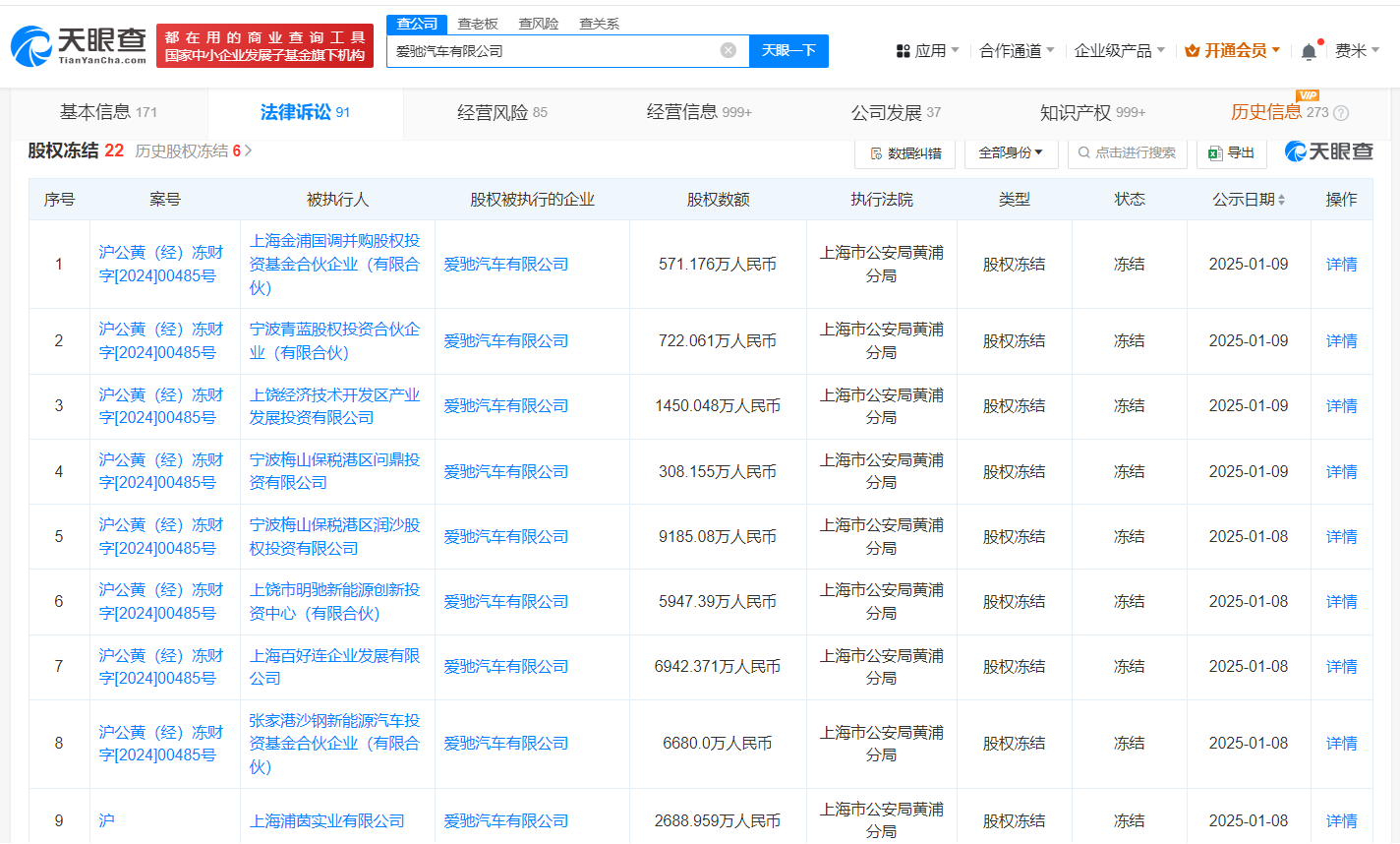 天眼查深度风险信息显示,近日,爱驰汽车有限公司新增10余条股权冻结信息,股权被执行的企业为该公司,被执行人包括该公司的股东上海金浦国调并购股权投资基金合伙企业(有限合伙)、宁波青蓝股权投资合伙企业(有限合伙)等,冻结股权数额合计8.6亿余元,执行法院为上海市公安局黄浦分局。