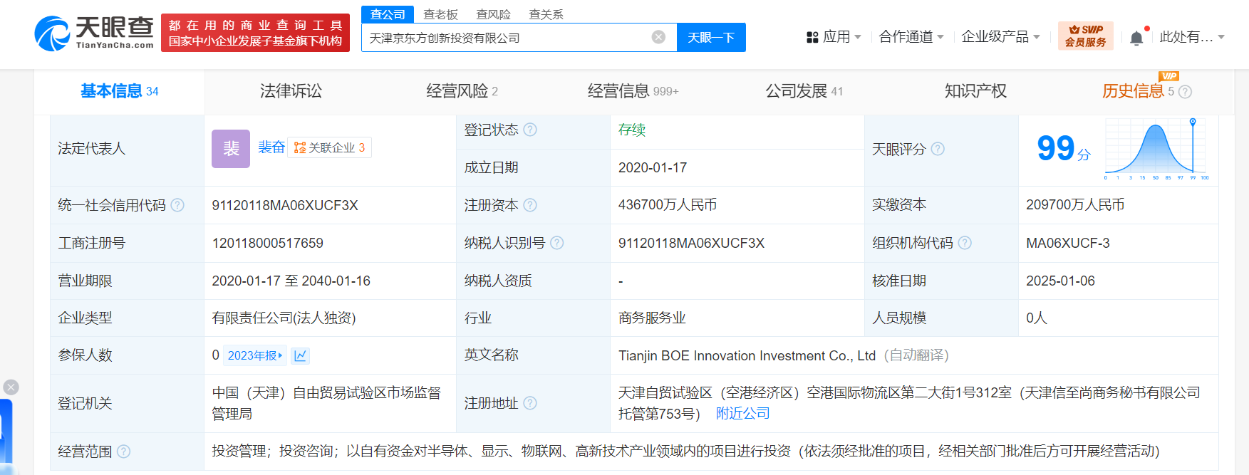 天眼查App显示,近日,天津京东方创新投资有限公司发生工商变更,注册资本由23.67亿人民币增至43.67亿人民币,增幅约84.5%。