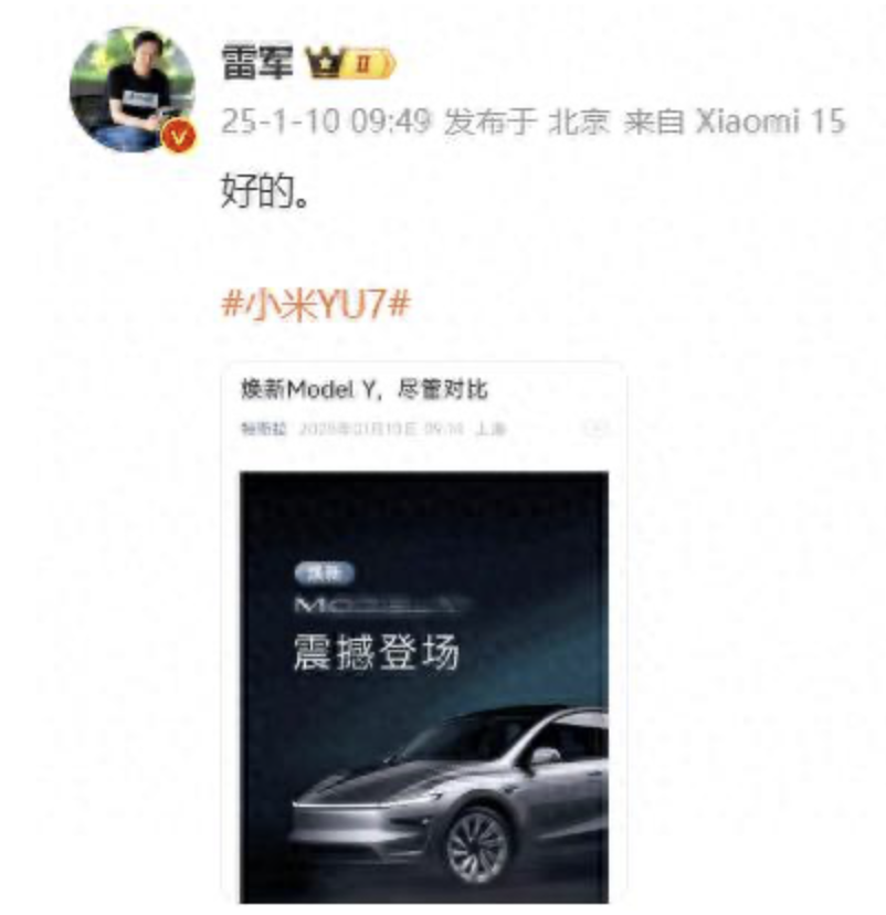 值得注意的是,特斯拉在其社交媒体推送的相关文章标题为《焕新Model Y,尽管对比》,小米集团董事长雷军网速太快了,直接幽默霸气回应“好的。”
